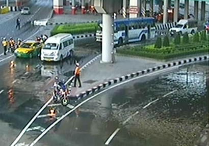 - ถนนวิภาวดี ช่องทางคู่ขนาน ก่อน ถึง ตึกชินวัตร 3 มีน้ำเอ่อสูงเท่าฟุตปาธแล้ว ขณะที่ ปั๊มน้ำมัน ปตท. สำนักงานใหญ่ กระทรวงพลังงาน ซึ่งเป็นที่ตั้งทำการของ ศปภ. ใหม่ มีน้ำเอ่อขึ้นระดับสูงประมาณ 20 เซนติเมตร