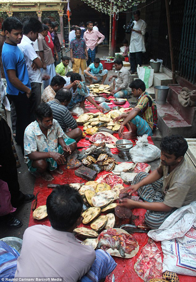 เมื่อวันที่ 27 ตุลาคมที่ผ่านมา เว็บไซต์เดลิเมลของอังกฤษ รายงานว่า ชาวบ้านในเมืองฐากาของบังกลาเทศ ประกอบพิธีกรรมทางศาสนาสุดเหี้ยมโหด ฆ่าเต่ากว่าแสนตัวบูชาพระแม่กาลีตามพิธีทางศาสนาฮินดู
