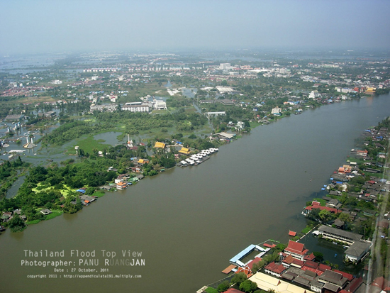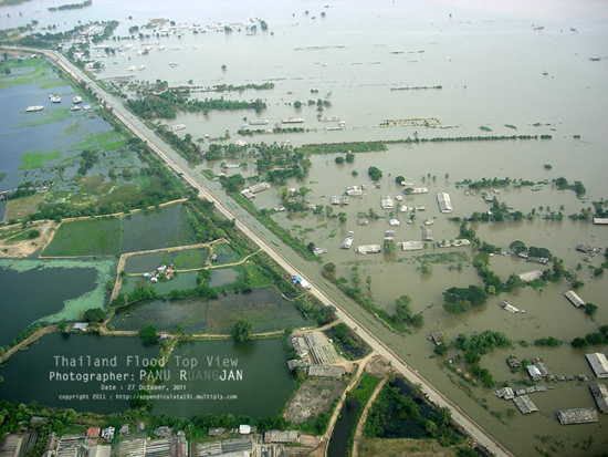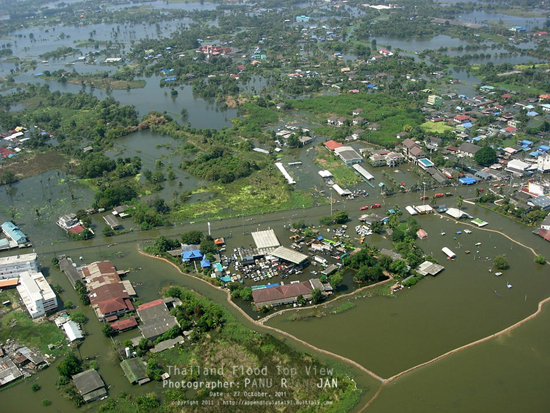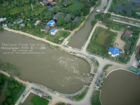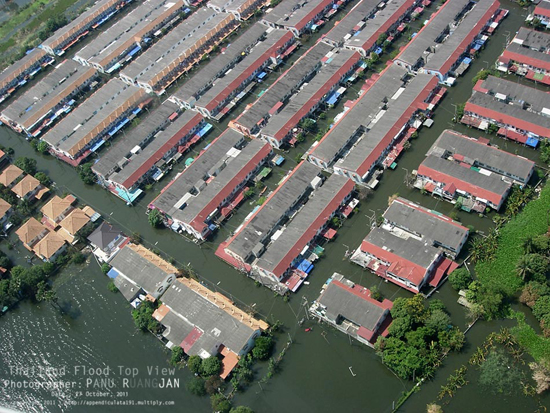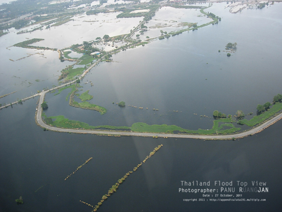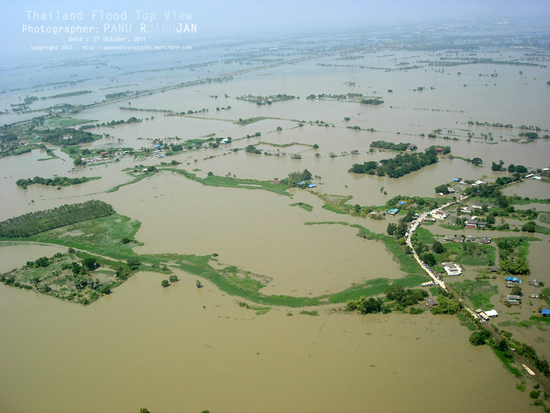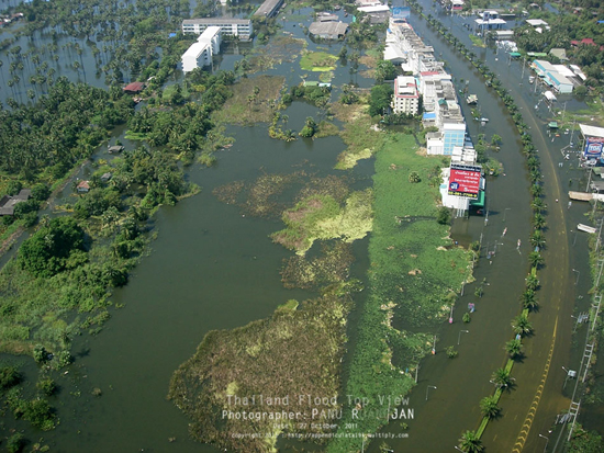 แต่จะเห็นได้จากภาพถ่ายมุมสูงของ คุณ appendiculata191 ถ่ายเมื่อวันที่ 27 ตุลาคม พ.ศ. 2554 ที่เรานำมาบอกต่อกัน สะท้อนให้เห็นอีกมุมมองหนึ่งของกรุงเทพมหานคร ปทุมธานี พระนครศรีอยุธยา และอ่างทอง ว่าประชาชนต่างเดือนร้อนกันถ้วนหน้า หลาย ๆ ต่อหลายครัวเรือนต้องอพยพหลบหนีออกนอกพื้นที่ ปล่อยให้หมู่บ้านกลายเป็นเมืองร้าง เพราะน้ำท่วมสูงเกินกว่าจะอยู่อาศัย หลายพื้นที่กลายเป็นเกาะ ทั้ง ๆ ที่แต่ก่อนรถราเคยวิ่งผ่าน