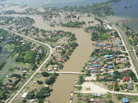 ตรงกลางภาพน้ำล้นจากแม่น้ำ ด้านริมขวาถนนท่วมและบ้านเรือนก็จมน้ำ