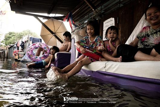 ดูเหมือนเย็นดี มีเตียงน้ำให้นอน แต่น้ำเหม็นมาก ต้องทนนอนและอยู่กับมันแบบนี้ เดินไปไหนไม่ได้ เพราะต้องไปล้างเท้าอีก น้ำสะอาดมีไม่พอ เก็บไว้อาบ บ้านนี้เห็นคุณตากับคุณยายนอนอยู่ 2 คน เห็นเปิดทีวีไว้ นอนหลับ น้ำขึ้นสูงเรื่อย ๆ อดในไม่ได้ที่จะต้องแจ้งให้คุณตาระวังไฟฟ้า เพราะน้ำจะถึงปลั๊กไฟแล้ว...ชุมชนบ้านปูน แขวงบางยี่ขัน เขตบางพลัด