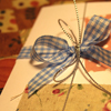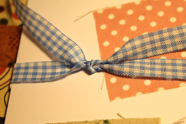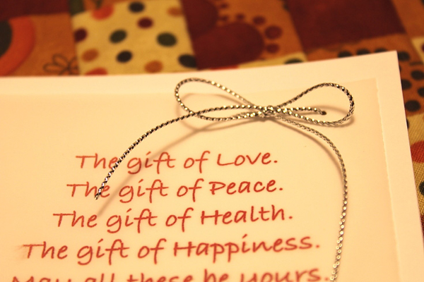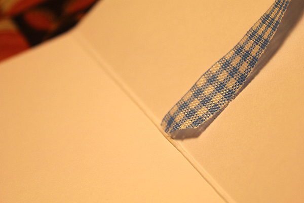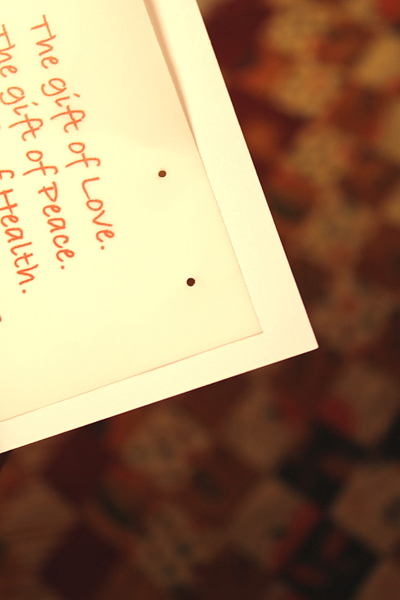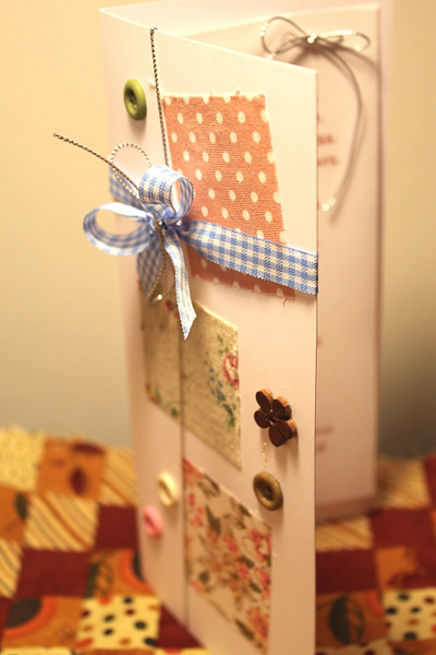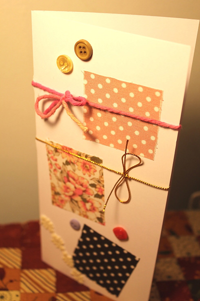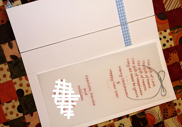 ร้อยเชือกผูกโบว์ค่ะ เพื่อยึดกระดาษอวยพรติดตัวการ์ด แทนการใช้กาวแปะ