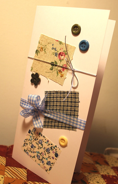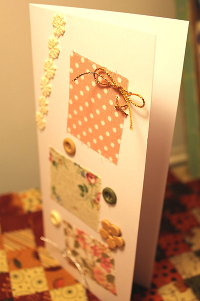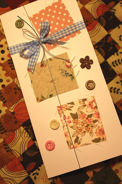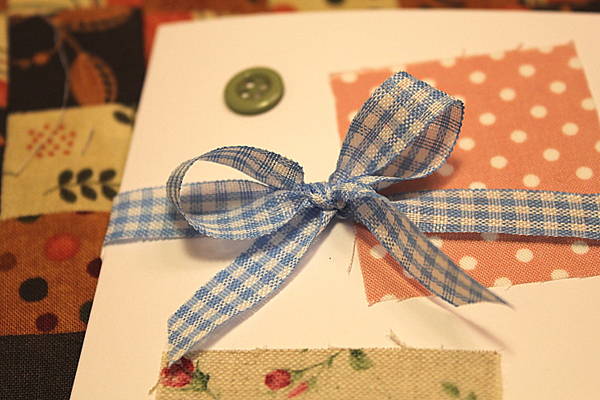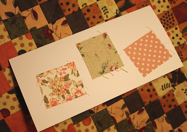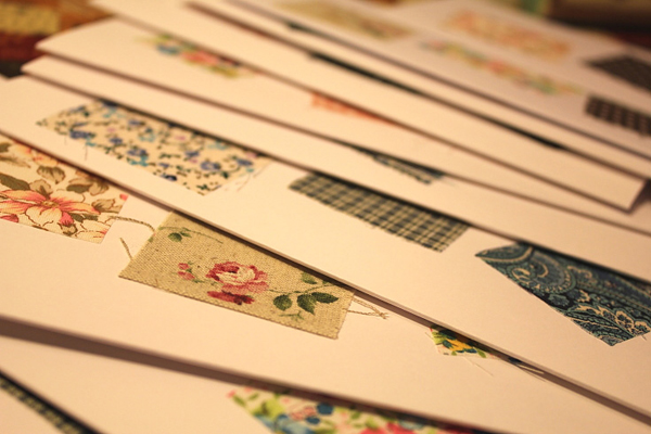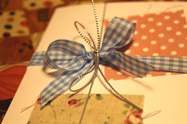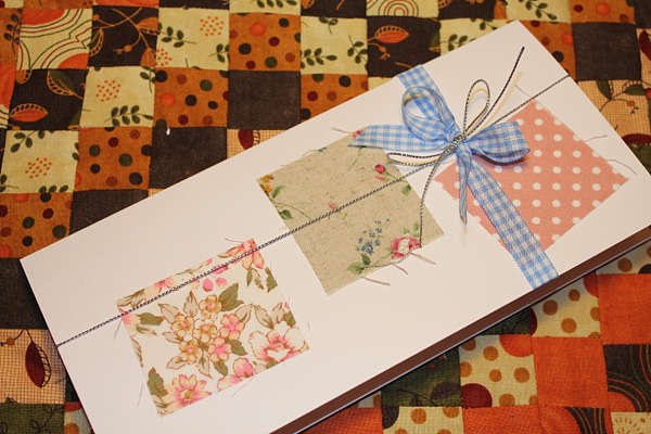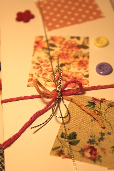 ทีนี้ก็มาตกแต่งกระดาษของเรากันดีกว่า ตัวช่วยของเราคือ เศษผ้าค่ะ ตัดเป็นสี่เหลี่ยม สามเหลี่ยมอะไรก็ตามใจค่ะ จากนั้นก็เอามาทากาว ป้าย ๆ จนทั่ว แปะ ๆ ในตำแหน่งที่ต้องการ
