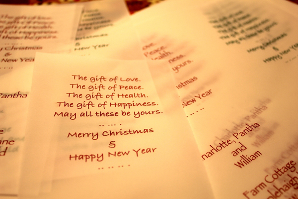 จากนั้นมาทำข้อความอวยพรค่ะ เราใช้กระดาษลอกลายนะคะ จะอวยพรว่าอย่างไรก็เขียนไป ที่เห็นนี้เราพริ้นท์อีกแล้ว แหะ ๆ เขียนเองไม่ไหว ก็เหมือนเดิม ใช้โปรแกรมโฟโต้ชอปจัดวางข้อความ กระดาษ A4 หนึ่งแผ่น ทำได้เยอะค่ะของเราข้อความมันยาว ทั้งลงชื่อครอบครัว ที่อยู่ หนึ่งแผ่น เราได้ 3 ชิ้นค่ะ เลือกตัวอักษร สี จัดวางตำแหน่ง แล้วก็พริ้นท์ จากนั้นก็ตัดแยก จะใช้กรรไกร ใช้คัตเตอร์ก็ตามสะดวกนะคะ