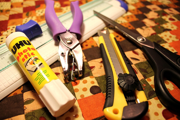 - ที่เจาะกระดาษ (อันนี้ไม่จำเป็น มีเข็มใหญ่ ๆ หรือเข็มวงเวียน ใช้แทนกันได้)