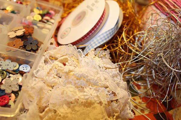 - ด้ายสี ๆ ริบบิ้น เชือก ไหมพรม ไหมเลื่อม ลูกไม้จิ๋ว ๆ ฯลฯ หาที่มีอยู่ในบ้านอ่ะค่ะ)