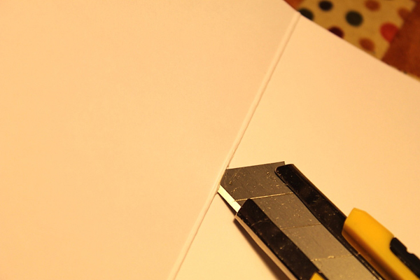 มองจากด้านหน้า แล้วกะตำแหน่งผูกโบว์ค่ะ ใช้คัตเตอร์กรีดเป็นรอยแยกเล็ก ๆ ให้พอสอดริบบิ้นได้