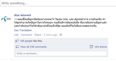 เมื่อไม่กี่ชั่วโมงที่ผ่านมานี้ หนึ่งในผู้ให้บริการด้านเครือข่ายโทรศัพท์เคลื่อนที่ของไทยอย่างดีแทค ได้ออกประกาศแจ้งผู้ใช้งานผ่านทางโซเชียลมีเดียต่าง ๆ เช่น ทวิตเตอร์ของดีแทค @dtac_feelgoood, เฟซบุ๊กดีแทค ตลอดจนเว็บไซต์พันทิป ว่า "ขณะนี้พบปัญหา voice & data ในเขต กทม. และ สมุทรปราการ ทำให้ลูกค้าอาจเกิดปัญหาในการโทรออก รวมถึงบริการอินเตอร์เน็ต ทีมงานรับทราบปัญหาแล้ว และกำลังเร่งแก้ไขให้กลับมาปกติโดยเร็วที่สุด ขออภัยในความไม่สะดวกค่ะ"