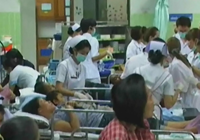 สำหรับผู้บาดเจ็บสาหัส 3 ราย รายแรกเป็นหญิงชาวจังหวัดชัยนาท ถูกแท่งเหล็กยาว 1.5 เมตร ทิ่มที่ด้านหลัง บาดแผลยาวประมาณ 40 เซนติเมตร แพทย์ได้นำตัวเข้าห้องผ่าตัดเพื่อเอาเหล็กออก และให้เลือด 8 ยูนิต, รายที่ 2 เป็นชายอายุ 40 ปี ศีรษะแตกมีบาดแผลที่ใบหน้า และรอบ ๆ โพรงจมูก ต้องใช้เครื่องช่วยหายใจ ขณะนี้รู้สึกตัวดี และรายที่ 3 เป็นหญิงอายุ 70 ปี รายนี้อาการวิกฤติอยู่ในขั้นน่าห่วง มีอาการหยุดหายใจก่อนถึงโรงพยาบาล แพทย์กระตุ้นหัวใจ และใช้เครื่องช่วยหายใจ ขณะนี้ยังไม่รู้สึกตัว โดยหญิงรายนี้มีประวัติมีโรคประจำตัวคือ โรคเบาหวาน และความดันโลหิตสูง แพทย์ได้ทำการเอ็กซเรย์คอมพิวเตอร์ ไม่พบสิ่งผิดปกติในสมอง ขณะนี้นอนพักรักษาตัวอยู่ที่ห้องไอซียูโรงพยาบาลศุภมิตร