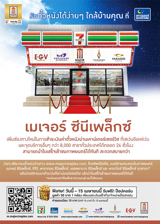 อย่างไรก็ตาม ล่าสุด ทางเมเจอร์ได้ร่วมเป็นพันธมิตรกับบริษัท ซีพี ออลล์ จำกัด (มหาชน) เพื่อเปิดบริการเมเจอร์ เอ็กซ์เพลส ทิคเก็ต เซอร์วิส ณ เคาน์เตอร์เซอร์วิส ที่มีอยู่ในร้านเซเว่น อีเลฟเว่น กว่า 6,000 สาขา และเคาน์เตอร์เซอร์วิสอีก 2,000 สาขา รวม 8,000 สาขา เพื่อให้เป็นแหล่งชำระตั๋วชมภาพยนตร์ โดยนำรหัส 6 หลักที่ได้จากการเข้าไปจองตั๋วทางโทรศัพท์มือถือ, แอพพลิเคชั่น, เว็บไซต์, และเฟซบุ๊ก ซึ่งจะช่วยลดเวลาการจ่ายเงินที่บ็อกซ์ ออฟฟิศ โดยจะเสียค่าบริการบิลละ 15 บาท ต่อการจองที่นั่ง 6 ที่ และคาดว่าบริการดังกล่าว จะทำให้มีผู้ชมเพิ่มขึ้นในอัตรา 10-20%