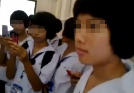 และเมื่อคลิปวิดีโอดำเนินมาถึงช่วงท้าย ๆ นักเรียนหญิงรุ่นพี่ สั่งให้รุ่นน้องก้มลงกราบที่เท้าแล้วจะปล่อยตัวไป จนกระทั่งนักเรียนหญิงรุ่นน้องยอมก้มลงทราบจริง แต่เมื่อรุ่นน้องก้มลงกราบเสร็จ รุ่นพี่กลับโมโห ด่าทออย่างรุนแรง ก่อนจะกระหน่ำทำร้ายทุบตี จิกหัวตบหน้ารุ่นน้องอย่างรุนแรง โดยที่เพื่อน ๆ พยายามห้ามปราม