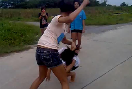แม้ว่าน.ส.พีท จะสู้ไม่ไหวและล้มกับพื้นไปแล้ว แต่ น.ส.อ้อมก็ยังจิกหัวและกระหน่ำตบต่อไป พร้อมกับจับหัวโขกพื้นจนเสียงดัง ท่ามกลางเสียงเชียร์ของกลุ่มเพื่อนที่รายล้อมอยู่ จนในที่สุดเมื่อเห็นว่า น.ส.พีทเริ่มสู้ไม่ไหว น.ส.อ้อมจึงลุกออกไปและตะโกนถาม จบไหม ๆ ๆ ๆ ?