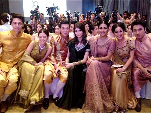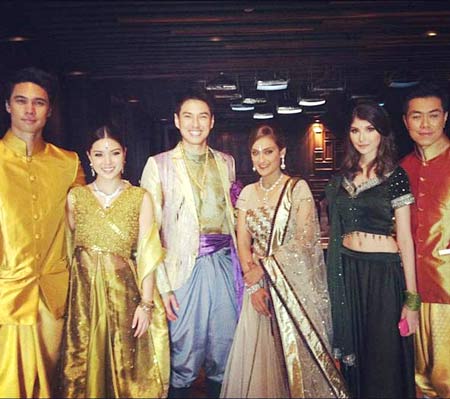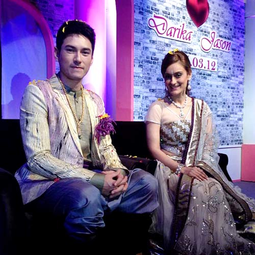 ส่วน เจสัน ยัง มาในชุดไทยประยุกต์สีสันสดใสประดับดอกไม้ติดที่หน้าอก สื่อความหมายคือ ดิน น้ำ ลม ไฟ ไม้ ทอง ส่วนดอกไม้ที่ติดอยู่บนหน้าอกเสื้อของชุดเจ้าบ่าวนั้นสื่อถึง รักแรกพบ สำหรับ ดาริกา อยู่ในชุดอินเดียแรงก้า ซึ่งเปิดตัวเปิดตัวบนไฮโดรลิกอย่างอลังการ สร้างความฮือฮาให้กับแขกที่มาร่วมงานเป็นอย่างยิ่ง