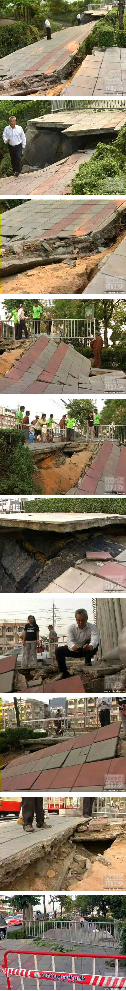 3. เกิดจากอายุการใช้งานนาน 20 ปี และที่สำคัญได้มีการปรับปรุงทางเท้าบ่อยครั้ง ส่งผลให้เกิดการกดทับจากน้ำหนักในการปรับปรุงทางเท้า ทำให้ทางเท้าไม่สามารถรับน้ำหนักที่สอดรับกับแนวกำแพงคันดินเดิมได้แล้วเกิดการทรุดตัวลง