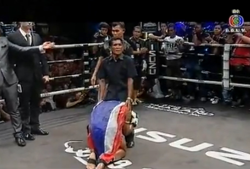 จากนั้นทางพิธีกรได้เชิญคุณพ่อของบัวขาวขึ้นมาบนเวที ซึ่งบัวขาวเห็นพ่อก็ได้กราบเท้าพ่อ ท่ามกลางเสียงโห่ร้องชื่นชมยินดีกับแฟนมวยที่มาดูอย่างมากมาย ส่วนด้านคุณพ่อของบัวขาวก็กลั้นน้ำตา ตื้นตันใจที่ได้มาดูมวยของลูกชายแบบใกล้ชิดครั้งแรก ...