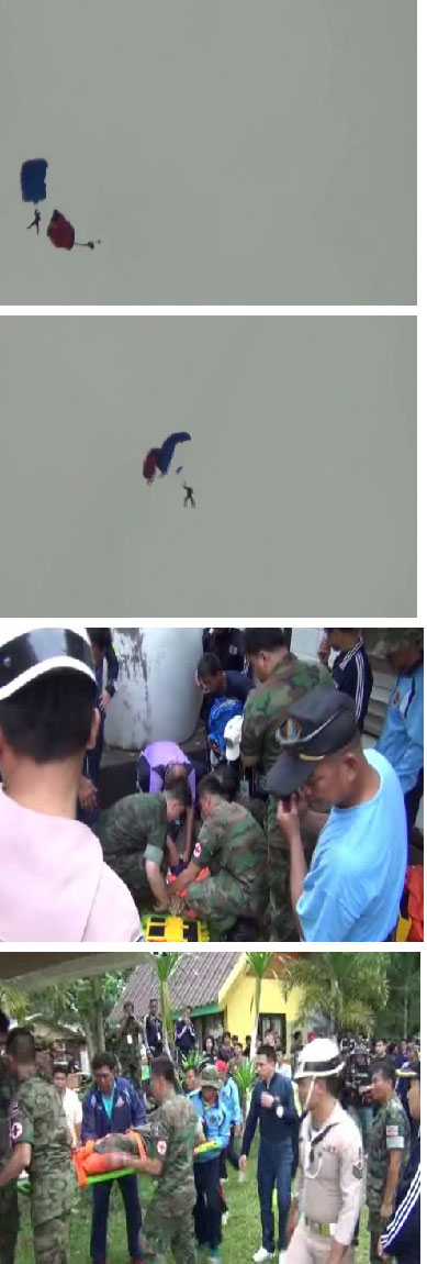 นายทหารกองทัพบกร่วมแข่งโดดร่ม ปรากฏเชือกพันขา ไม่สามารถควบคุมร่มได้ ก่อนจะค่อย ๆ ร่วงดิ่งลงสู่พื้น ได้รับบาดเจ็บ แต่ไม่มาก