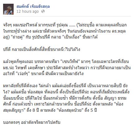 มหาลัยที่ปรีดีตั้งเอง ไม่กล้าแม้แต่เอ่ยถึงชื่อ ปรีดีเป็นเวลาหลายสิบปี ยังไง? แม้แต่ชื่อ ห้องสมุดที่ตอนนี้ ตั้งเป็นชื่อปรีดีน่ะ ตอนที่เริ่มมีประเพณีตั้งชื่อแบบนี้ ปรีดีไมใช่ ชื่อแรกด้วยซ้ำที่มีการตั้งกัน มีการตั้งชื่อ สัญญา ธรรมศักดิ์ ก่อนด้วยซ้ำ เพราะไม่กล้าขนาดนั้น ชื่อปรีดี ตั้งตามหลัง "ห้องสมุดสัญญา" ถึง 8 ปี ตามหลัง "ห้องสมุดป๋วย" ถึง 5 ปี บอกตรง ๆ อย่าดัดจริตมากไปครับ"