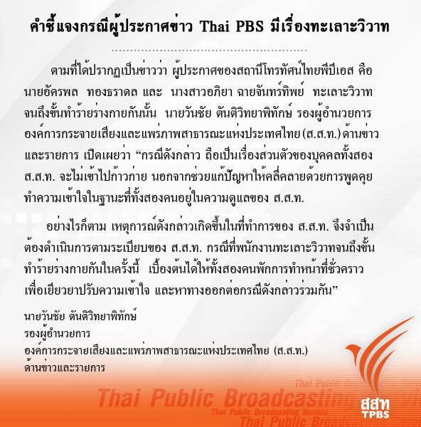 จากกรณีที่ ผู้ประกาศข่าว 2 คน ทางสถานีไทยพีบีเอส คือ นายอัครพล ทองธราดล และ นางสาวอภิยา ฉายจันทร์ทิพย์ เกิดเหตุวิวาททะเลาะกันรุนแรงภายในสถานี ส่งผลให้นายอัครพลได้รับบาดเจ็บ เย็บถึง 38 เข็ม ตามที่ได้เสนอข่าวไปก่อนหน้านี้