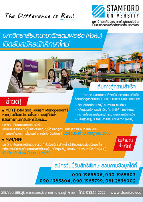 • MBA หลักสูตรรัฐประศาสนศาสตรมหาบัณฑิต / MBA หลักสูตร บริหารธุรกิจบัณฑิต มหาวิทยาลัยนานาชาติแสตมฟอร์ด (หัวหิน) กำลังรับสมัครผู้ที่สนใจเข้าศึกษาต่อระดับปริญญาโท หลักสูตรบริหารธุรกิจมหาบัณฑิต (MBA), หลักสูตรรัฐประศาสนศาสตรมหาบัณฑิต (MPA) เรียนสัปดาห์ละ 1 วัน (วันอาทิตย์) เปิดเรียนวันที่ 24 มิถุนายน 2555