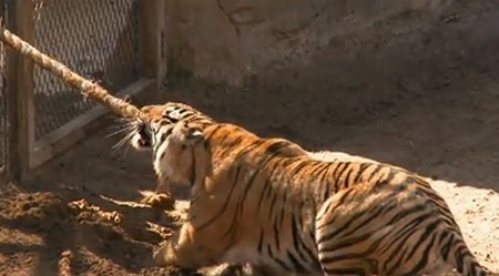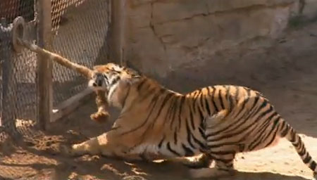 เอ้า ไม่รู้ว่าเจ้าเสือจะเอ็นจอยกับการแข่งขันชักเย่อข้ามสายพันธุ์แบบนี้หรือเปล่า แต่ที่แน่ ๆ คือมันออกแรงดึงทีเดียว อีกฝั่งก็ไหลพรืดไปตามแรงเสียแล้ว แบบนี้ถ้าเกิดกรงที่กั้นไว้ล้มลงมา ก็คงตัวใครตัวมันละนะทุกคน