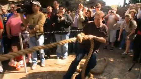 เกมชักเย่อระหว่างคนกับเสือนี้ เป็นกิจกรรมของสวนสัตว์ บุสช์ การ์เด้น ซึ่งอยู่ในเขตแทมบา เบย์ รัฐฟลอริด้า สหรัฐฯ ผู้เข้าแข่งขันทั้งสองฝ่าย อยู่คนละฝั่งของกรงตาข่ายสองชั้นที่เจาะรูกลม ๆ ไว้ตรงกลางสำหรับให้เชือกชักเย่อลอดผ่านได้ แต่ไม่รู้ว่าเกมนี้ยุติธรรมหรือเปล่า เพราะในขณะที่ฝั่งคน มีผู้เข้าแข่งขันนั้นช่วยกันดึงเชือกได้ทีละหลาย ๆ คน แต่ฝั่งคุณเสือที่มีอยู่ทั้งหมด 7 ตัว จะมาเหนี่ยวเชือกได้แค่ครั้งละตัวเท่านั้น ...แต่ถึงจะดูเหมือนเสียเปรียบออกอย่างนั้น กลับกลายเป็นว่า เป็นฝ่ายของเสือเจ้าป่าที่ชนะเอา ๆ ได้แทบทุกครั้งเลยแฮะ