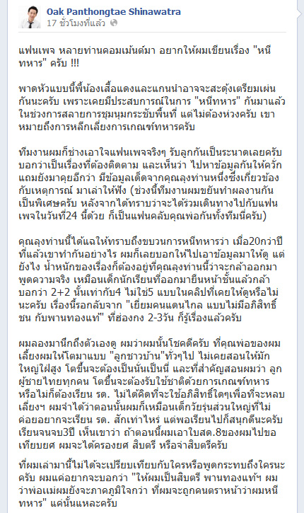 "แฟนเพจ หลายท่านคอมเม้นท์มา อยากให้ผมเขียนเรื่อง "หนีทหาร" ครับ !!! พาดหัวแบบนี้ พี่น้องเสื้อแดงและแกนนำอาจจะสะดุ้งเตรียมเผ่นกันนะครับ เพราะเคยมีประสบการณ์ในการ "หนีทหาร" กันมาแล้วในช่วงการสลายการชุมนุมกระชับพื้นที่ แต่ไม่ต้องห่วงครับ เขาหมายถึงการหลีกเลี่ยงการเกณฑ์ทหารครับ