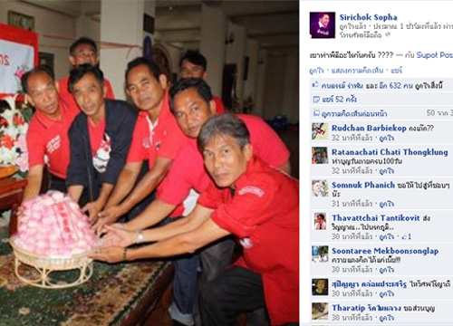 เมื่อวันที่ 27 กรกฎาคม นายศิริโชค โสภา ส.ส.สงขลา พรรคประชาธิปัตย์ โพสต์รูปภาพกลุ่มคนเสื้อแดงทำบุญวันเกิดให้กับ พ.ต.ท.ทักษิณ ชินวัตร อดีตนายกรัฐมนตรี ในเฟซบุ๊กส่วนตัว โดยได้บรรยายายข้อความในภาพว่า "เขาทำพิธีอะไรกันครับ???" เนื่องจากในภาพมีกลุ่มคนเสื้อแดง จำนวน 7 คน กำลังนำถาดบรรจุขนมคล้ายซาลาเปาเป็นจำนวนมาก มาวางไว้หน้ารูป พ.ต.ท.ทักษิณ ในลักษณะคล้ายการถวาย