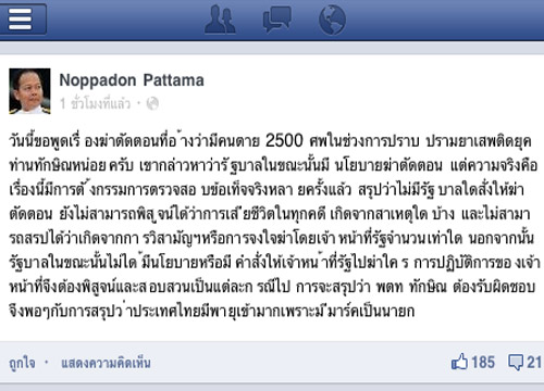 วันที่ 4 สิงหาคม นายนพดล ปัทมะ ที่ปรึกษากฎหมาย พ.ต.ท.ทักษิณ ชินวัตร อดีตนายกรัฐมนตรี โพสต์เฟซบุ๊กส่วนตัว ระบุ "วันนี้ขอพูดเรื่องฆ่าตัดตอน ที่อ้างว่า มีคนตาย 2,500 ศพ ในช่วงการปราบปรามยาเสพติดยุคของ พ.ต.ท.ทักษิณ เนื่องจาก มีผู้กล่าวหาว่า รัฐบาลในขณะนั้นมีนโยบายฆ่าตัดตอน แต่ความจริงคือ เรื่องนี้มีการตั้งกรรมการตรวจสอบข้อเท็จจริงหลายครั้งแล้ว สรุปว่า ไม่มีรัฐบาลใดสั่งให้กระทำดังกล่าว พร้อมทั้งยังไม่สามารถพิสูจน์ได้ว่า การเสียชีวิตในทุกคดีเกิดจากสาเหตุใดบ้าง และไม่สามารถสรุปได้ว่าเกิดจากการวิสามัญฯ หรือ การจงใจฆ่า โดยเจ้าหน้าที่รัฐจำนวนเท่าใด ทั้งนี้ รัฐบาลในขณะนั้นไม่ได้มีนโยบาย หรือ มีคำสั่งให้เจ้าหน้าที่รัฐไปฆ่าใคร ดังนั้น การปฏิบัติการของเจ้าหน้าที่ จึงต้องพิสูจน์และสอบสวนในแต่ละกรณีไป"