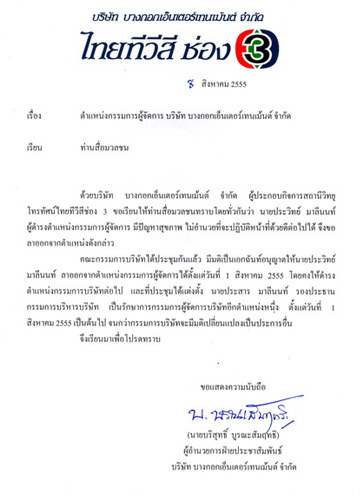 โดยข่าวดังกล่าว ได้รับจดหมายแจ้งจากประชาสัมพันธ์ บริษัท บางกอกเอ็นเตอร์เทนเม้นต์ จำกัด ไทยทีวีสี ช่อง 3 ลงวันที่ 8 สิงหาคม 2555 ได้แจ้งว่า ด้วย บริษัท บางกอกเอ็นเตอร์เทนเม้นต์ จำกัด ผู้ประกอบกิจการสถานีวิทยุ โทรทัศน์ ไทยทีวีสีช่อง 3 ขอเรียนให้ท่านสื่อมวลชนทราบทั่วกันว่า นายประวิทย์ มาลีนนท์ ผู้ดำรงตำแหน่งกรรมการผู้จัดการ มีปัญหาสุขภาพ ไม่อำนวยที่จะปฏิบัติหน้าที่ด้วยดีต่อไปได้ จึงขอลาออกจากตำแหน่งดังกล่าว