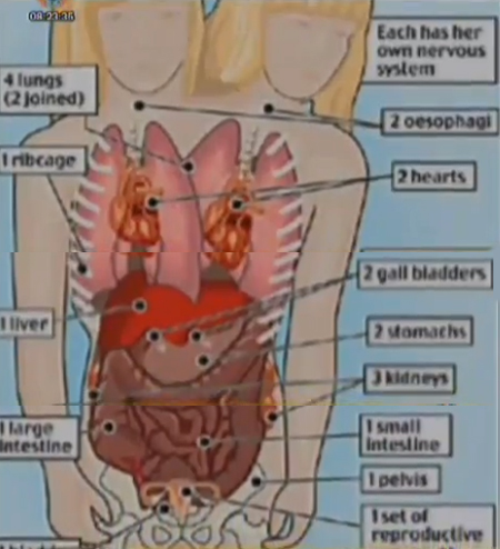 อบิเกล (ขวา) และ บริตทานี่ (ซ้าย) มีทั้งอวัยวะส่วนที่เป็นของตัวเองและส่วนที่ต้องใช้ร่วมกัน ทั้งคู่ต่างมีกระดูกสันหลังแยกจากกัน (และมารวมกันที่ส่วนเชิงกราน) มีหัวใจ 2 ดวง, 2 หลอดอาหาร, 2 กระเพาะอาหาร, 3 ไต, 2 ถุงน้ำดี, ปอด 4 ข้าง (มี 2 ข้างที่ใช้ร่วมกัน) แต่มีตับเดียว ซี่โครงชุดเดียว ใช้ระบบไหลเวียนเลือดร่วมกัน และมีระบบประสาทร่วมกันบางส่วน ส่วนอวัยวะทางส่วนล่างของร่างกาย ได้แก่ ลำไส้, กระเพาะปัสสาวะ และระบบสืบพันธุ์นั้น ใช้ร่วมกันทั้งหมด ทั้งนี้ ทั้งคู่ได้รับการผ่าตัดแขนข้างที่สามซึ่งงอกออกมาจากทรวงอกออกตั้งแต่ยังเป็นทารก และเข้ารับการผ่าตัดแก้ไขปัญหากระดูกสันหลังคด และขยายขนาดทรวงอกเพื่อให้สะดวกต่อการหายใจมากขึ้นเมื่ออายุ 12 ปี
