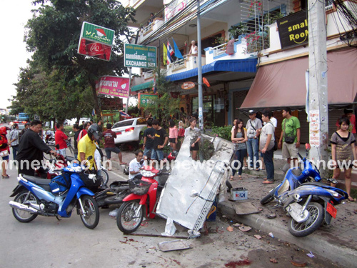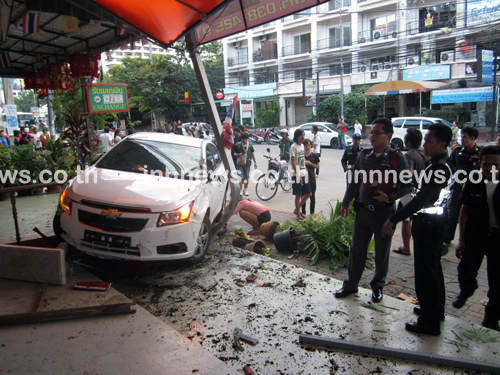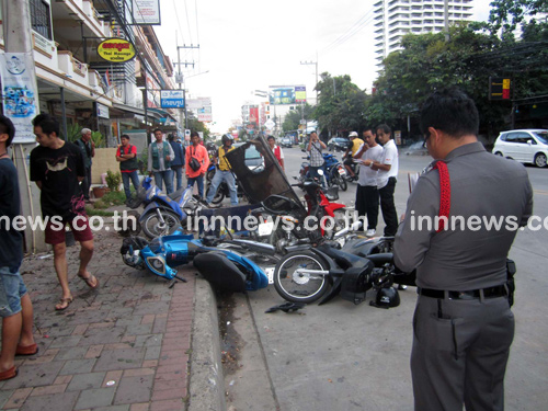 ช่วงเช้าวันนี้ (5 กันยายน) เจ้าหน้าที่ตำรวจ สภ.เมืองพัทยา จ.ชลบุรี ได้รับแจ้งเหตุว่า มีรถยนต์เก๋งเฉี่ยวชนกับรถจักรยานยนต์จอดอยู่ข้างทางได้รับความเสียหายหลายคัน และมีผู้บาดเจ็บ 1 ราย จึงรุดไปตรวจสอบที่เกิดเหตุ ปรากฏว่าพบรถยนต์ป้ายแดง ยี่ห้อเชฟโรเลต ครูซ สีขาว หมายเลขทะเบียนป้าย ก 4455 ชลบุรี สภาพด้านหน้ายุบ กระจกแตกร้าว ขับเกยขึ้นมาชนกับเสาป้ายของร้าน โดยทับรถจักรยานยนต์จอดอยู่ข้างทางอยู่ใต้ท้องรถยนต์เก๋ง 1 คัน และห่างออกไปประมาณ 10 เมตร ก็พบรถจักรยานยนต์อีก 6 คัน อยู่ในสภาพล้มคว่ำ