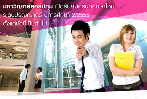 ม.ศรีปทุม รับสมัครนักศึกษาใหม่ ระดับปริญญาตรี ภาค 2 ปีการศึกษา 2555 ตั้งแต่บัดนี้เป็นต้นไป ในคณะนิติศาสตร์ คณะบริหารธุรกิจ คณะบัญชี คณะวิศวกรรมศาสตร์ คณะเทคโนโลยีสารสนเทศ คณะนิเทศศาสตร์ คณะสถาปัตยกรรมศาสตร์ คณะดิจิทัลมีเดีย คณะศิลปศาสตร์ และวิทยาลัยนานาชาติ ณ มหาวิทยาลัยศรีปทุม บางเขน