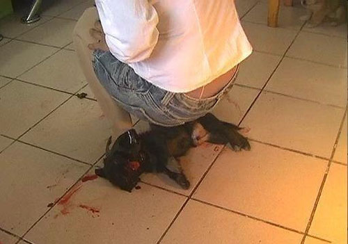 รูปภาพเหล่านี้มีที่มาจากที่ใด แหล่งข่าวไม่ได้ระบุไว้ แต่แสดงให้เห็นเพียงภาพเหตุการณ์สุดเลือดเย็นที่สามารถเล่าเรื่องราวทั้งหมดโดยไม่จำเป็นต้องอธิบายด้วยคำพูดใด ๆ เลย เมื่อหญิงสาวนักศึกษารายหนึ่ง ได้บันทึกภาพของตัวเองระหว่างสวมรองเท้าส้นสูงเหยียบลูกสุนัขขนปุกปุย 2 ตัว จนคอหักตาย ขณะที่พื้นห้องก็เปรอะไปด้วยเลือดสุนัข นับเป็นภาพที่น่าสลดใจมาก