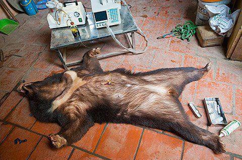 หมีตัวนี้คือ หมีควายครับ มันสลบอยู่ และขวดสีน้ำตาลนั้นก็คือขวดใส่น้ำดีของมัน เครื่องขาว ๆ บนโต๊ะนั่นก็คือเครื่อง Suction ดูดของเหลวออกจากร่างกาย