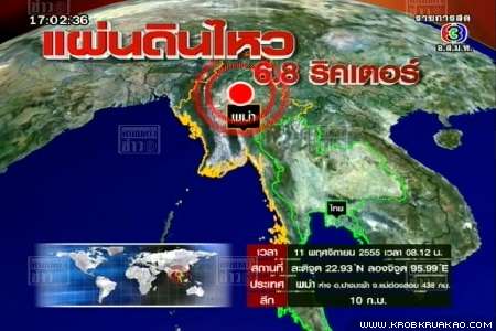 นายสมิทธ ธรรมสโรช ประธานมูลนิธิเตือนภัยพิบัติแห่งชาติ เปิดเผยถึงเหตุแผ่นดินไหวที่ประเทศพม่าที่เกิดขึ้นเมื่อช่วงเช้าของวานนี้ (11 พฤศจิกายน) ว่า แผ่นดินไหวดังกล่าว เกิดจากรอยเลื่อนสะแกง ขณะที่มีความรุนแรงกว่า 6 ริกเตอร์ ซึ่งถือว่าการสั่นไหวอยู่ในขั้นรุนแรงมาก แน่นอนต้องเกิดความเสียหายและผู้คนล้มตายไม่น้อย แต่ทางการพม่าปิดข่าวนี้ ไม่ทราบว่าทางการพม่ามีเหตุผลอย่างไร เพราะแรงสั่นสะเทือนต้องมาถึงประเทศไทยอยู่แล้ว เนื่องจากจุดศูนย์กลางอยู่ห่างจากกรุงเทพฯ เพียง 300 กว่ากิโลเมตร ทำให้กรุงเทพฯ ได้รับแรงไหวมากกว่าที่อื่น