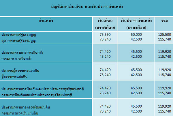 จากตารางดังกล่าวในข้างต้น จะเห็นว่า หากคำนวณอัตราเงินเดือนและเงินประจำตำแหน่ง ของผู้ดำรงตำแหน่งต่าง ๆ ประกอบด้วย