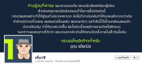"ท่านผู้ชมที่เคารพ ผมกราบขออภัย และขอรับผิดแต่เพียงผู้เดียว สำหรับเหตุการณ์ขัดข้องหมองใจในการซื้อบัตรวันนี้ เจตนาผมคิดแต่จะทำให้ผู้ชมทั่วประเทศสะดวก คิดไม่ถึงว่ามันกลับทำให้ทุกคนลำบากกว่าเดิม คำตำหนิด่าทอทั้งหมาย ผมสมควรโดนครับ สมควรจริง ๆ ขอสิ่งนี้ไว้เป็นบทเรียนสอนตัวนำมาปรับปรุงทำให้ทุกอย่างดีขึ้น และในช่วงนี้ขอยุติการขายบัตรไปสักระยะ จนกว่าจะพบช่องทางที่ดีกว่า และมาบอกกล่าวกันให้ทราบอีกครั้งภายในเร็ววันนี้ครับ"