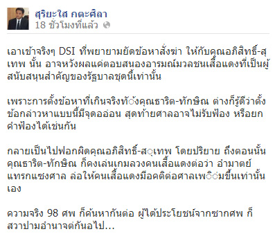 โดยข้อความดังกล่าว ระบุว่า "เอาเข้าจริง ๆ DSI ที่พยายามยัดข้อหาสั่งฆ่า ให้กับคุณอภิสิทธิ์-สุเทพ นั้น อาจหวังผลแค่ตอบสนองอารมณ์มวลชนเสื้อแดงที่เป็นผู้สนับสนุนสำคัญของรัฐบาลชุดนี้เท่านั้น เพราะการตั้งข้อหาที่เกินจริงทั้งคุณธาริต-ทักษิณ ต่างก็รู้ดีว่าตั้งข้อกล่าวหาแบบนี้มีจุดออ่อน สุดท้ายศาลอาจไม่รับฟ้อง หรือยกคำฟ้องได้เช่นกัน