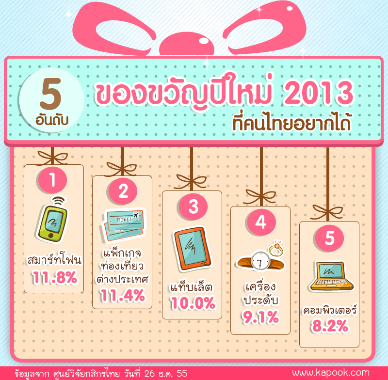 โดยผลสำรวจของขวัญที่คนไทยอยากได้รับในช่วงเทศกาลส่งท้ายปีเก่าต้อนรับปีใหม่ 5 อันดับแรกนั้น ได้แก่