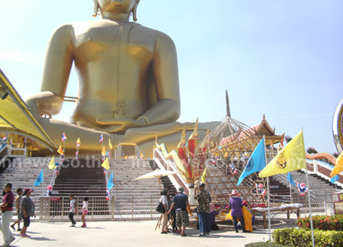 ผู้สื่อข่าวได้เดินทางไปยัง วัดม่วง ต.หัวตะพาน อ.วิเศษชัยชาญ จ.อ่างทอง เนื่องจาก ท่านเจ้าอาวาส พระครูสุภัทรพระครูเขตสุนทร จะจัดงานฉลองสมโภช เจริญพระพุทธมนต์ชัยมงคลคาถาเบิกพระเนตร หลวงพ่อพระพุทธมหานวมินทร์ศากยมุนีศรีวิเศษชัยชาญ (พระพุทธรูปใหญ่สุดในโลก) ขนาดองค์พระหน้าตักกว้าง 63 เมตร สูง 95 เมตร โดยไฮไลท์ของงานได้มีการจัดทำชะลอมยักษ์ ซึ่งฐานชะลอมเป็นขันโตกที่ใหญ่ที่สุดในโลก โดยชะลอมสื่อว่าจังหวัดอ่างทอง เป็นศูนย์จักรสานที่ใหญ่ที่สุดในประเทศ และเป็นสินค้า 0TOP ของจังหวัดอ่างทอง ขันโตก ก็เป็นตัวแทนของภาคเหนือ เนื่องจาก ท่านเจ้าอาวาส พระครูสุภัทรเขตสุนทร เป็นคนเชียงใหม่ ขนาดของชะลอม กว้าง 4 เมตร 9 นิ้ว สูง 6 เมตร 9 นิ้ว ส่วนขันโตก รอบวงกลม กว้าง 6 เมตร 9 นิ้ว ถือว่าเป็นชะลอมยักษ์ที่ใหญ่ที่สุดในประเทศและจะมีการนำชะลอมใบจิ๋วมาแทนซองผ้าป่า เพื่อให้ประชาชนได้มีส่วนร่วมทำบุญ เมื่อจะทำบุญก็ให้ใส่ปัจจัยลงในชะลอมเล็กและตั้งจิตอธิษฐาน พร้อมกับโยนชะลอมใส่รวมในชะลอมยักษ์ นับว่าเป็นที่ตื่นตาของญาติโยมที่เดินทางมาสักการะบูชาหลวงพ่อ ปัจจุบัน วัดม่วง เป็นสถานที่ท่องเที่ยวที่สำคัญแห่งหนึ่งใน จ.อ่างทอง มีผู้คนรู้จัก จำนวนมาก รวมไปถึงชาวต่างชาติ เพราะเป็นวัดที่มีองค์พระประธานที่ใหญ่ที่สุดในโลก