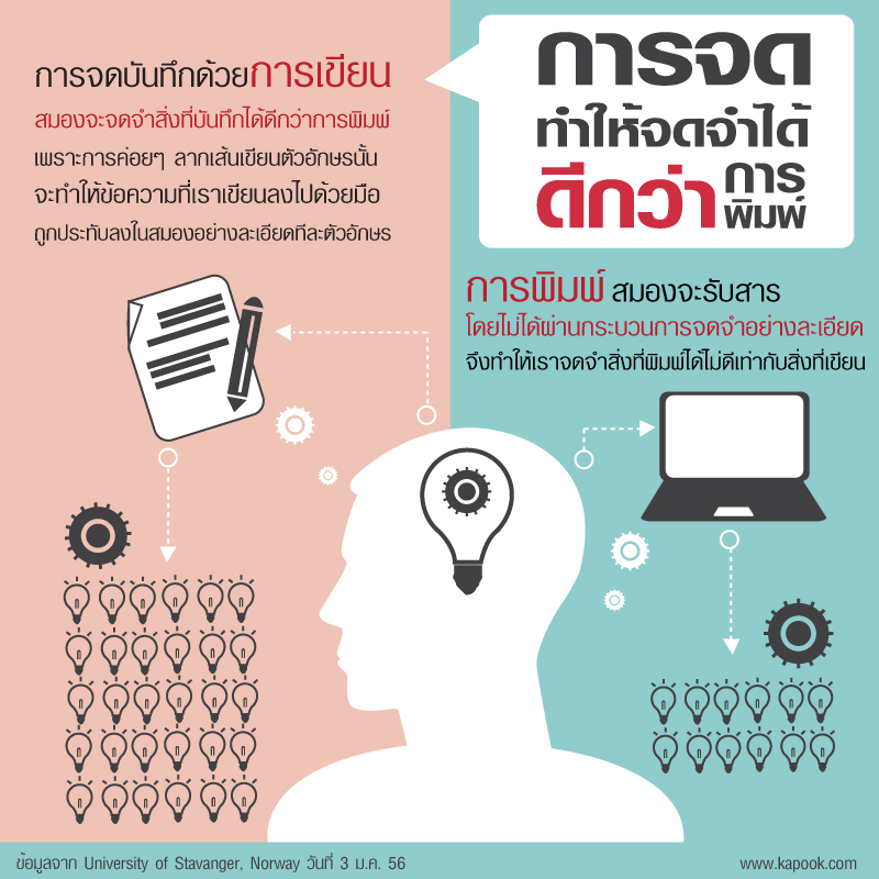 นักวิจัยจากมหาวิทยาลัยสตาวังเงร์ในนอร์เวย์ ได้เปิดเผยงานวิจัยน่าสนใจว่า การจดบันทึกด้วยการเขียนนั้น ทำให้สมองจดจำสิ่งที่บันทึกลงไปได้ดีกว่าการพิมพ์ เพราะการค่อย ๆ ลากเส้นเขียนตัวอักษรนั้น จะทำให้ข้อความที่เราเขียนลงไปด้วยมือถูกประทับลงในสมองอย่างละเอียดทีละตัวอักษร ส่วนการพิมพ์นั้น สมองจะรับสารโดยไม่ได้ผ่านกระบวนการค่อย ๆ จดจำอย่างละเอียดนี้ จึงทำให้เราจดจำสิ่งที่พิมพ์ได้ไม่ดีเท่ากับสิ่งที่เขียนนั่นเอง