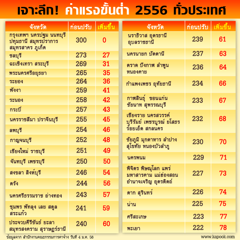 หลังจากที่รัฐบาลมีการประกาศขึ้นค่าแรงขั้นต่ำอย่างเป็นทางการ โดยให้มีผลตั้งแต่วันที่ 1 มกราคม พ.ศ. 2556 เป็นต้นไป ค่าแรงขั้นต่ำของแรงงานไทยจึงขยับขึ้นเป็น 300 บาททั่วประเทศ แต่ก่อนที่จะยิ้มรับค่าแรง 300 บาทกัน เรามีข้อมูลเจาะลึกค่าแรงขั้นต่ำ 2556 มาฝาก ว่าในแต่ละจังหวัดปรับขึ้นมากน้อยแค่ไหน ลองไปดูรายละเอียดกันเลยจ้า