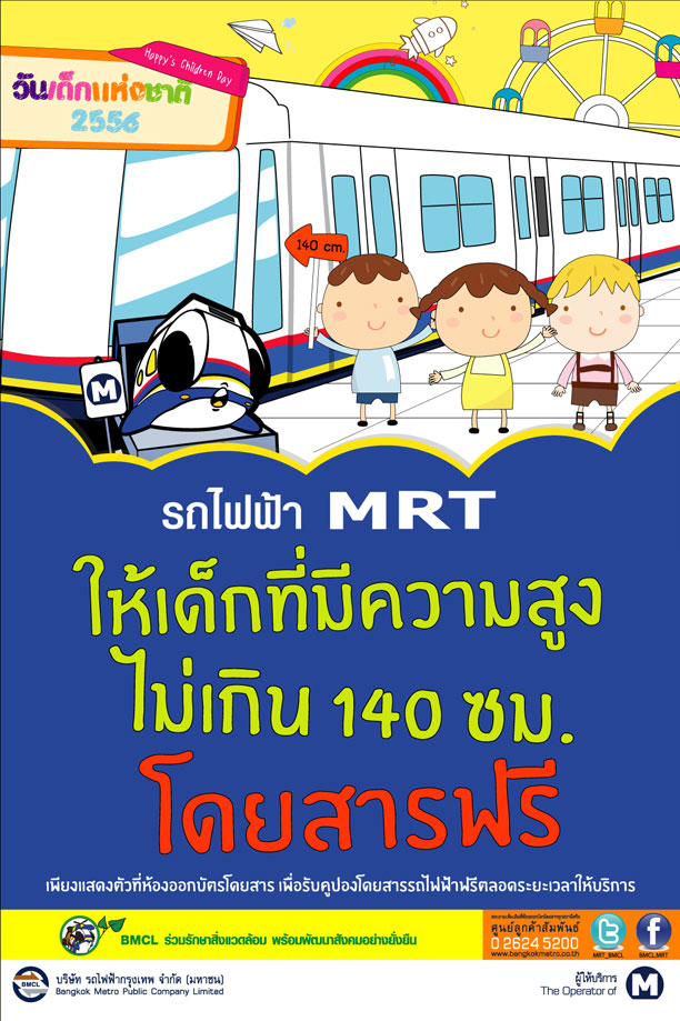 ขณะที่ ทางรถไฟฟ้า MRT ก็ขอมอบของขวัญวันเด็กเช่นกัน ด้วยการเปิดให้เด็กที่สูงไม่เกิน 140 เซนติเมตร และอายุไม่เกิน 14 ปี สามารถโดยสารรถไฟฟ้า MRT โดยไม่เสียค่าใช้จ่ายตลอดเวลาให้บริการ ตั้งแต่เวลา 06.00 น. ถึงเวลา 24.00 น. เพียงแสดงตัวต่อพนักงานประจำสถานีที่ห้องออกบัตรโดยสาร ทั้ง 18 สถานี