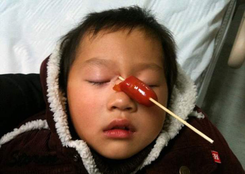 เมื่อวันที่ 9 มกราคมที่ผ่านมา เว็บไซต์เดลิเมลของอังกฤษ รายงานว่า เด็กชายหวังซีจุน วัย 6 ขวบ ในมณฑลอานฮุย ประเทศจีน เกือบจะต้องตาบอดหลังจากถูกไม้เสียบไส้กรอกปักเข้าที่หัวตาข้างซ้าย ลึกถึง 1.5 ซม. โดยเหตุเกิดขึ้นระหว่างที่ซีจุนกำลังนั่งทานไส้กรอกเสียบไม้อยู่ตรงเบาะด้านหลังของรถที่กำลังแล่น และเมื่อ นายหวังตง พ่อของเขาเหยียบเบรกอย่างกะทันหัน ไม้เสียบไส้กรอกที่เด็กชายกำลังทานอยู่ก็ปักเข้าที่ใบหน้าของเขา
