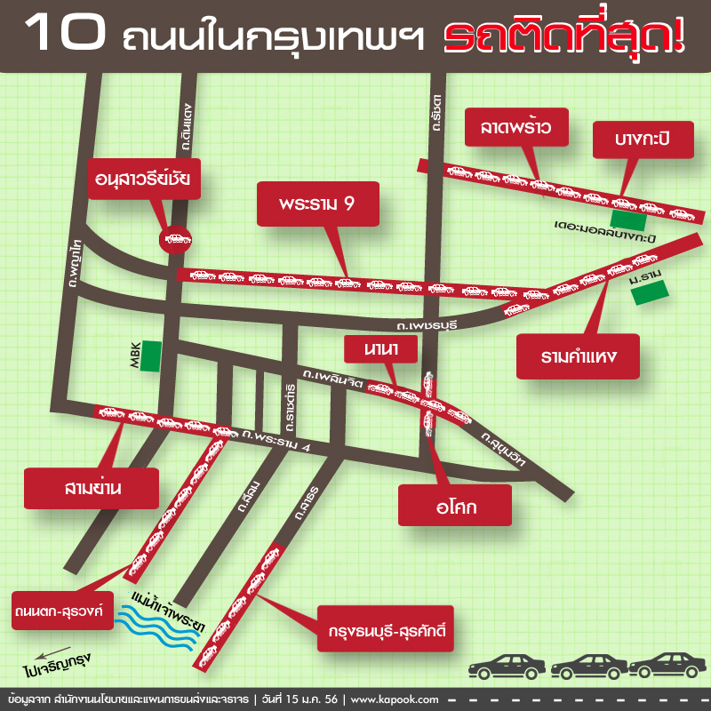 นอกจากนี้ แหล่งข่าวยังได้ระบุถึงผลสถิติการจราจร ของสำนักงานนโยบายและแผนการขนส่งและจราจร (สนข.) ที่เก็บข้อมูลเกี่ยวกับถนนที่วิ่งช้าที่สุดในกรุงเทพฯ ในรอบปี 2555 โดยมีถนน 10 สาย ดังนี้