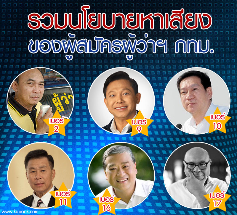 อย่างไรก็ตาม นอกจากผู้สมัครจาก 2 พรรคใหญ่แล้ว ก็ยังมีผู้สมัครอีกหลายคนที่เปิดตัวขอเป็นตัวเลือกให้กับพี่น้องชาวกรุงเทพมหานครที่เบื่อการเล่นกีฬาสี ซึ่งหลังจากปิดรับสมัครก็พบว่ามีผู้สมัครรับเลือกตั้งทั้งหมด 25 คน 25 เบอร์ แถมแต่ละคนก็ล้วนงัดเอาไม้เด็ดออกมาหาเสียงกันอย่างคึกคัก ตบท้ายด้วยนโยบายสุดแซ่บ...กระปุกดอทคอม จึงขอรวบรวมนโยบายเด็ด ๆ ของผู้สมัครมาให้ชาวกรุงเทพมหานครที่มีสิทธิเลือกตั้งได้พิจารณา เพื่อประกอบการตัดสินใจก่อนกากบาทเลือกหมายเลขที่ถูกใจในวันอาทิตย์ที่ 3 มีนาคม 2556