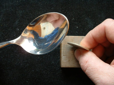 ขั้นตอนนี้ขอแนะนำใช้ช้อนทำนำไปก่อนจนกระทั่งรู้สึกว่า ขอบเหรียญพับเข้าไป อดทน อย่าใจร้อน เพราะต้องใช้เวลาหน่อย