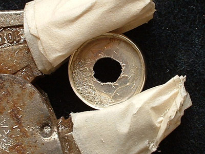 ใช้คีมหนีบตรงขอบเพื่อดึงสว่านออกจากเหรียญ เลือกใช้คีมหนีบที่ด้านในเป็นแนวโค้งจะดีกว่าคีมแบบตรง และเพื่อไม่ให้เหรียญบิดงอเสียหาย จะใช้เทป หนังยางหรือ พลาสติกพันบริเวณที่จะเสียดสีก็ได้เช่นกัน