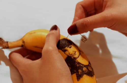 ก่อนหน้านี้มีศิลปินจีนที่วาดภาพบรรดาผู้นำจีนลงเมล็ดข้าวเม็ดเล็ก ๆ ซึ่งนั่นเราก็ว่าเจ๋งมากแล้ว ล่าสุด มีศิลปินนามว่า Honey ที่พยายามทำสิ่งที่เจ๋งพอกัน โดยเธอได้ค้นพบวิธีการเปลี่ยนกล้วยให้เป็นผลงานศิลปะได้ ตามที่เว็บไซต์ mymodernmet.com รายงานเมื่อวันที่ 9 กุมภาพันธ์ที่ผ่านมา ว่า ในบ้านของศิลปินผู้นี้จะเต็มไปด้วยกล้วยวางอยู่ ในวันหนึ่งเธอมองดูกล้วยพวกนี้ก่อนตัดสินใจวาดภาพลงบนเปลือกกล้วย
