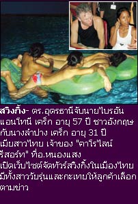 วานนี้ (14 มี.ค.) สำนักงานตำรวจภูธรจังหวัดอุดรธานี แถลงข่าวผลการจับกุมนายไบรอัน แอนโทนี เคร็ก อายุ 57 ปี ชาวอังกฤษ และนางลำปาง เคร็ก ภรรยาอายุ 31 ปี เจ้าของโรงแรม คาโรไลน์ รีสอร์ท เลขที่ 188 โคกสว่าง อ.หนองแสง จ.อุดรธานี 2 ผู้ต้องหาที่ร่วมกันเปิดรีสอร์ตจัดสวิงกิ้งในหุบเขากลางป่า เชิญชวนชาวต่างชาติจากทั่วโลกไปใช้บริการทางเพศมานานกว่า 4 ปี ในข้อหาร่วมกันเพื่อสนองความใคร่ของผู้อื่น เป็นธุระจัดหา ล่อไป หรือพาไปเพื่อการอนาจาร ซึ่งชายหรือหญิงแม้ผู้นั้นจะยินยอมก็ตาม, ร่วมกันประกอบการโรงแรมโดยไม่ได้รับอนุญาต